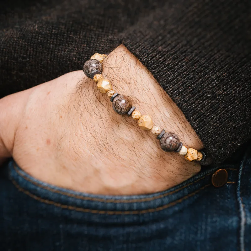 Komplet bransoletek damskiej i męskiej z kolekcji Ona i On wykonany jest z naturalnych kamieni: jaspisu i hematytu, nawleczonych na niebieskie sznurki. Damska bransoletka łączy delikatność jaspisu o ciepłych odcieniach brązu i beżu z kontrastującym połyskiem hematytu w odcieniu złota, co tworzy elegancką, a jednocześnie dynamiczną kompozycję. Męska bransoletka w podobnym stylu zyskuje wyrazistości dzięki zastosowaniu tych samych kamieni, które tworzą spójną całość z bransoletką dla kobiety, ale zachowują swoją męską prostotę i siłę.