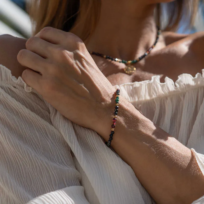 Głęboka czerń turmalinu zapewnia ochronę i usuwa negatywną energię, intensywna zieleń malachitu sprzyja dobrobytowi i emocjonalnej harmonii, a głęboka czerwień granatu dodaje odwagi, witalności i pasji. Całość dopełniają subtelne, pozłacane elementy, w tym delikatny kwiat ażurowy, nadający bransoletce lekkości i elegancji.