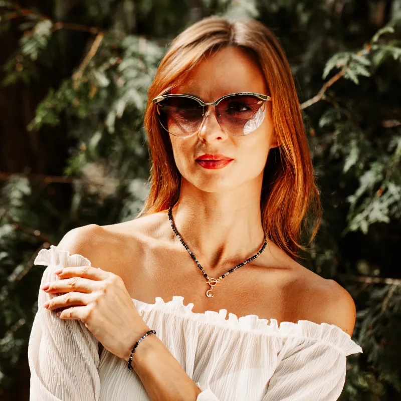 Konstrukcja bransolety bazuje na precyzyjnej selekcji kryształów rezonansowych, z których każdy pełni specyficzną funkcję w wektoryzacji energii. Centralnym punktem jest synchroniczne działanie Nocy Kairu (Goldstone) oraz Sodalitu. Noc Kairu, ze swoją głęboką, iskrzącą teksturą (charakteryzującą się wysokim połyskiem), symbolizuje ambicję i ochronę przed negatywnymi wibracjami, stanowiąc idealny akcent dla stylizacji wieczorowej i jesiennej. Kamień niebieski Sodalitu wzmacnia natomiast zdolności analityczne i promuje komunikację, integrując się z głębią czarnego koloru syntetycznego Kwarcytu (Nocy Kairu).Esencja Leonidy – Połączenie Czasu i Przestrzeni