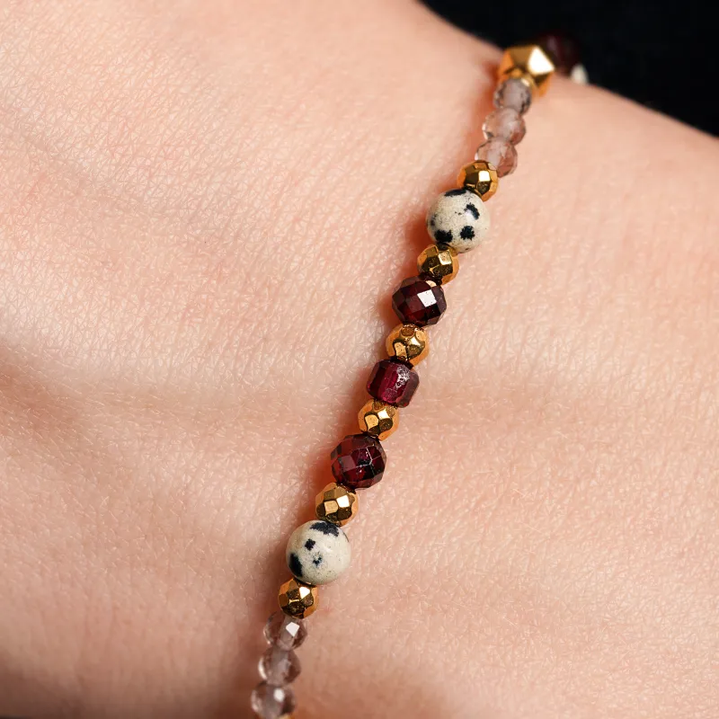- Kamienie: Starannie dobrane naturalne kamienie: Granat, Kwarc dymny, Jaspis, Hematyt, o lśniącym połysku.