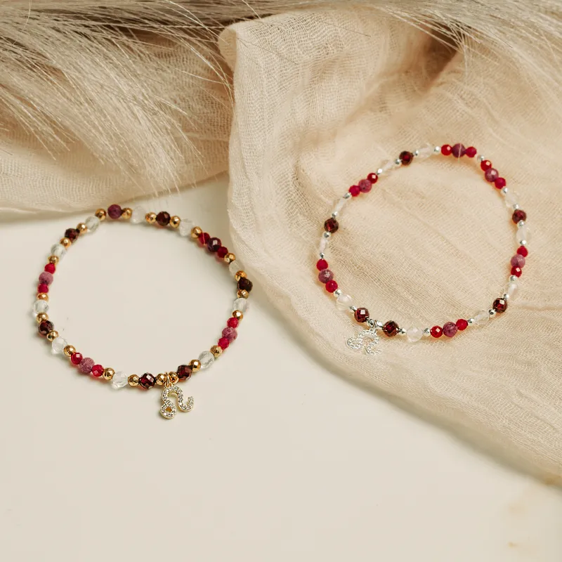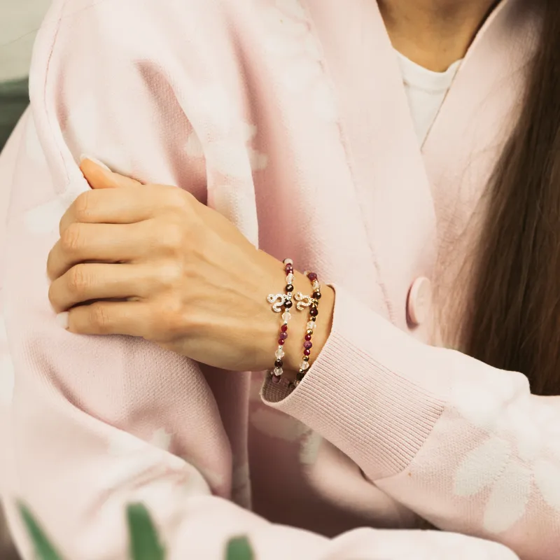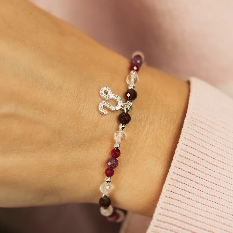 Rubin, Granat, Kryształ Górski - srebrna bransoletka na radość, miłość, szczęście - Lew