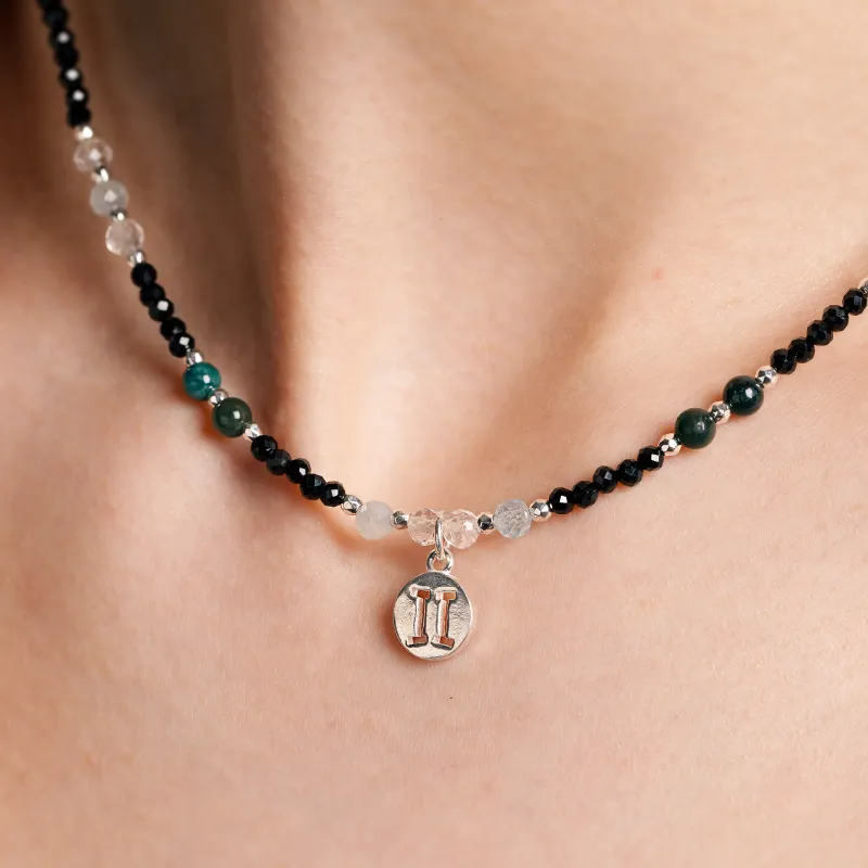 Akwamaryn, Kryształ Górski, Agat, Turmalin, Hematyt - srebrny naszyjnik na zdrowie, odwagę, harmonię - Bliźnięta