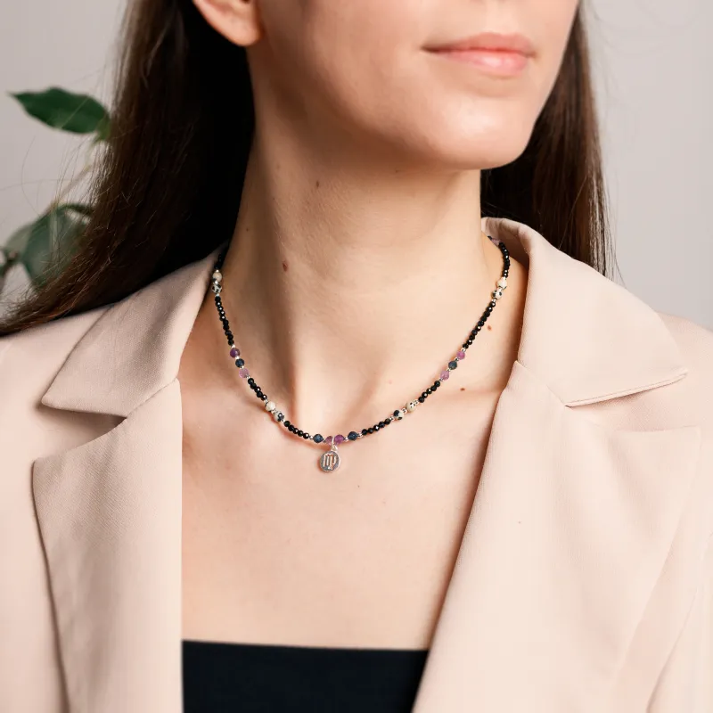 Ametyst, Jaspis, Szafir, Turmalin, Hematyt - srebrny naszyjnik na koncentrację, miłość, sukces - Panna
