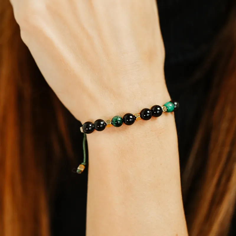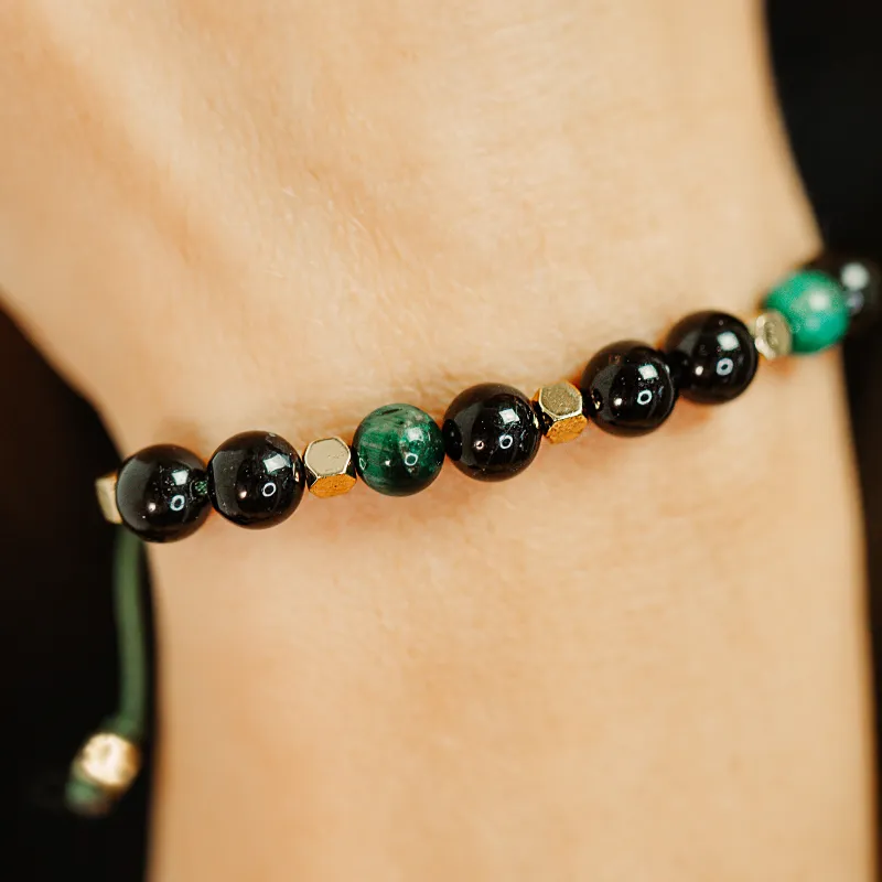 Starannie wyselekcjonowane kamienie – turmalin, tygrysie oko i hematyt – tworzą unikalną kompozycję o potężnym symbolicznym znaczeniu. Każdy z nich wnosi coś wyjątkowego, wzmacniając całość i dodając bransoletce niezwykłej mocy: