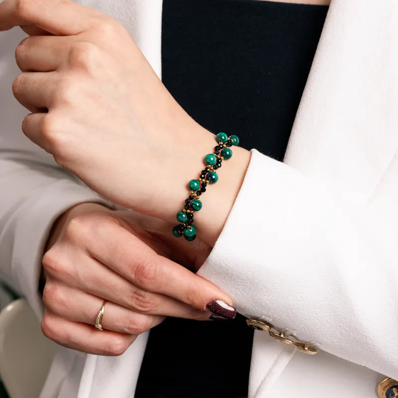 Turmalin, Malachit, Hematyt - srebrna pozłacana bransoletka na ochronę, bogactwo, uzdrowienie - Stella