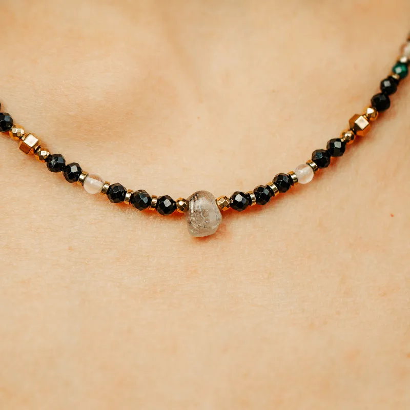 Turmalin, Malachit, Kryształ Górski - srebro pozłacane naszyjnik na ochronę, bogactwo, uzdrowienie - Lumina