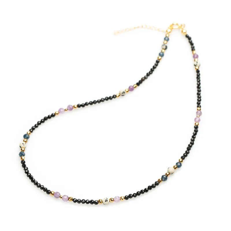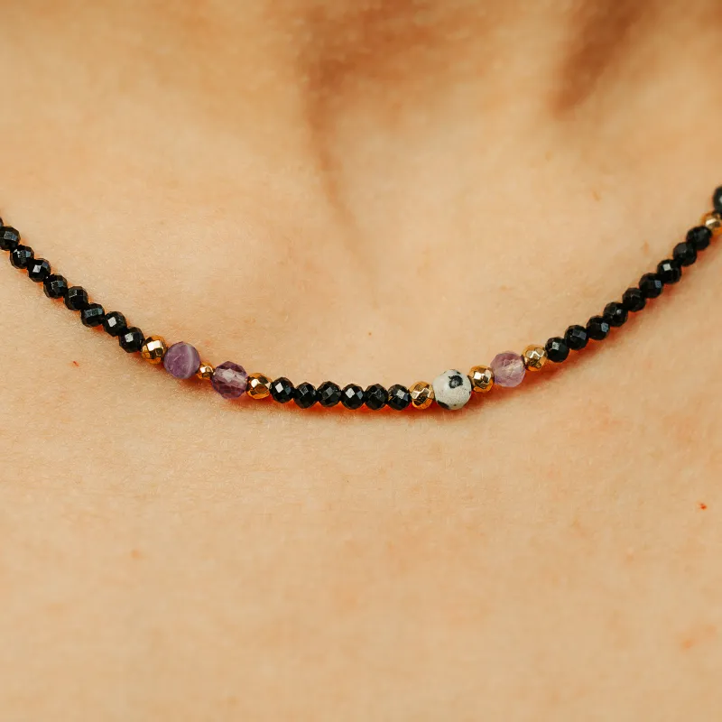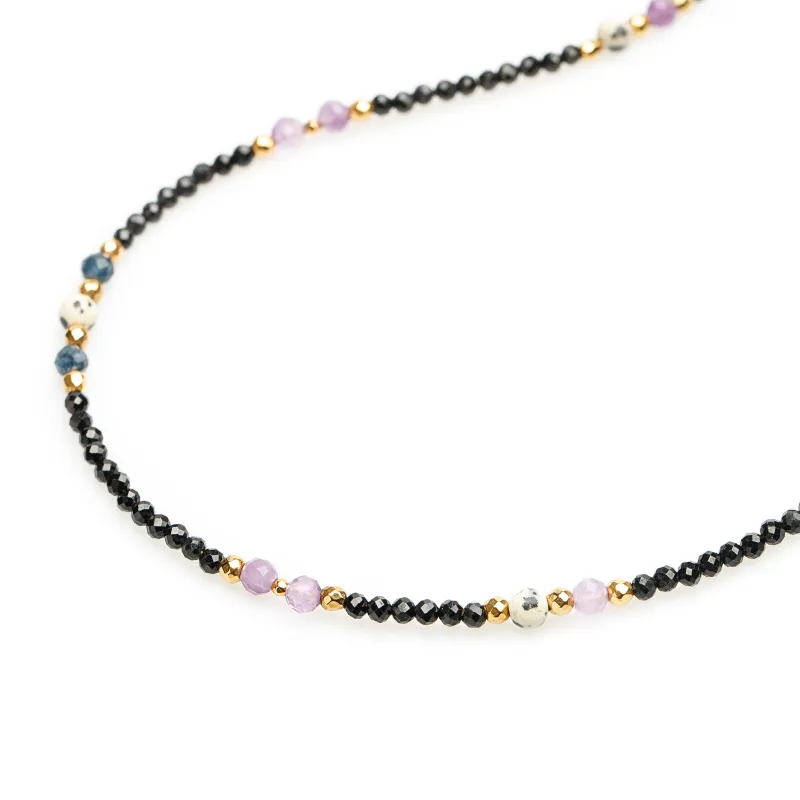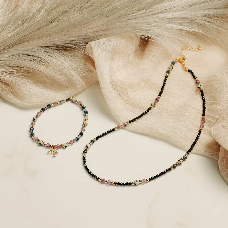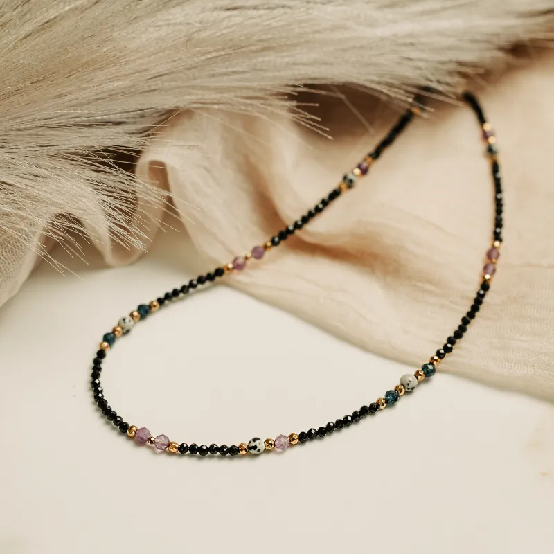 - Kamienie: Delikatne kulki o rozmiarze 3-4 mm, z dominującym fasetowanym Ametystem oraz gładkim Jaspisem i Szafirem.