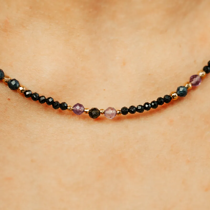 - Kompozycja kamieni, w tym Ametyst, Obsydian i Szafir, osadzona jest na delikatnym, ale wytrzymałym druciku.